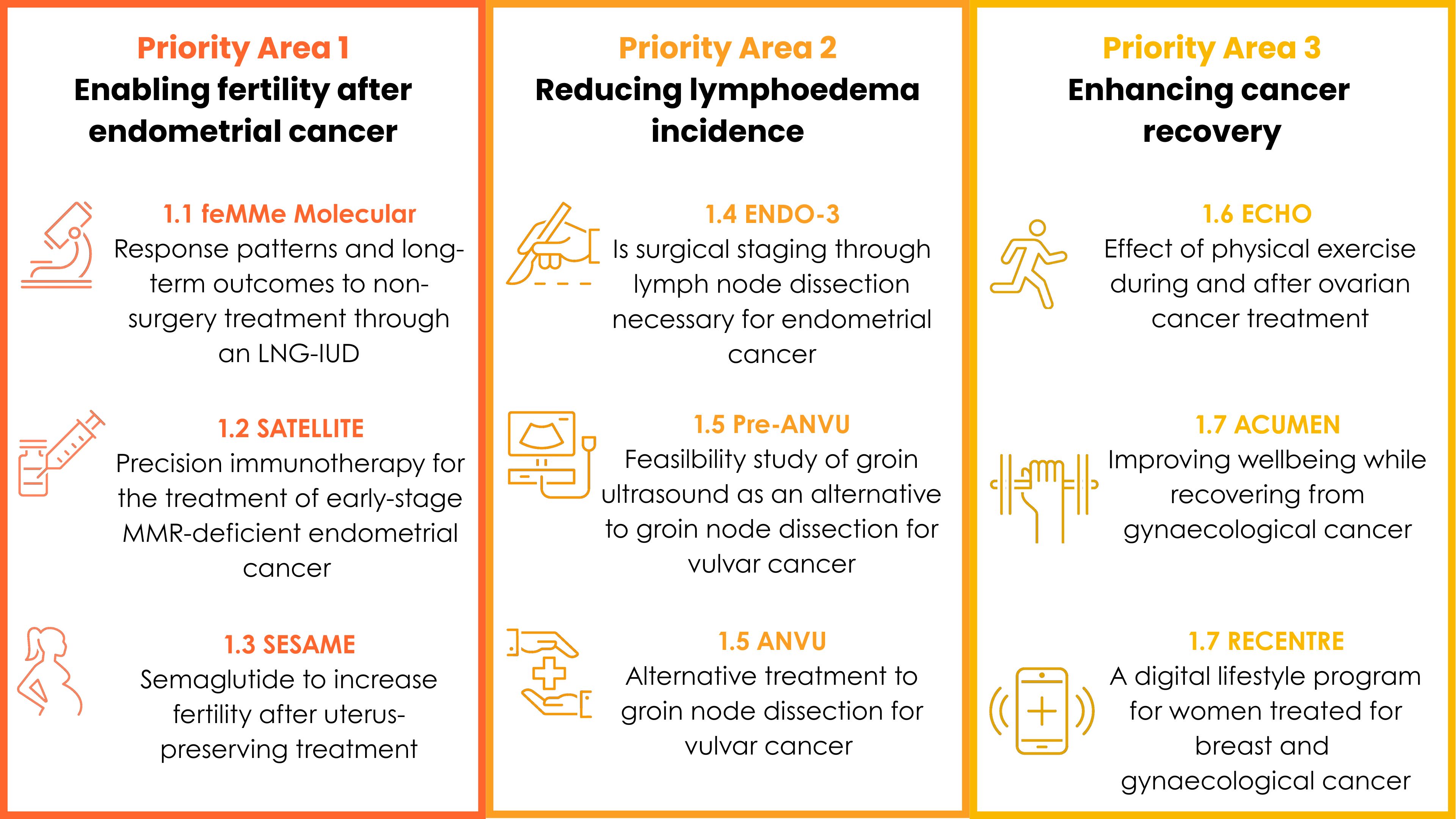 ALIVE WELL aims to move away from the outdated, rigid models currently offered as standard of care for gynaecological cancers, toward more contemporary, women-centred approaches. The three priority areas of research will focus on: